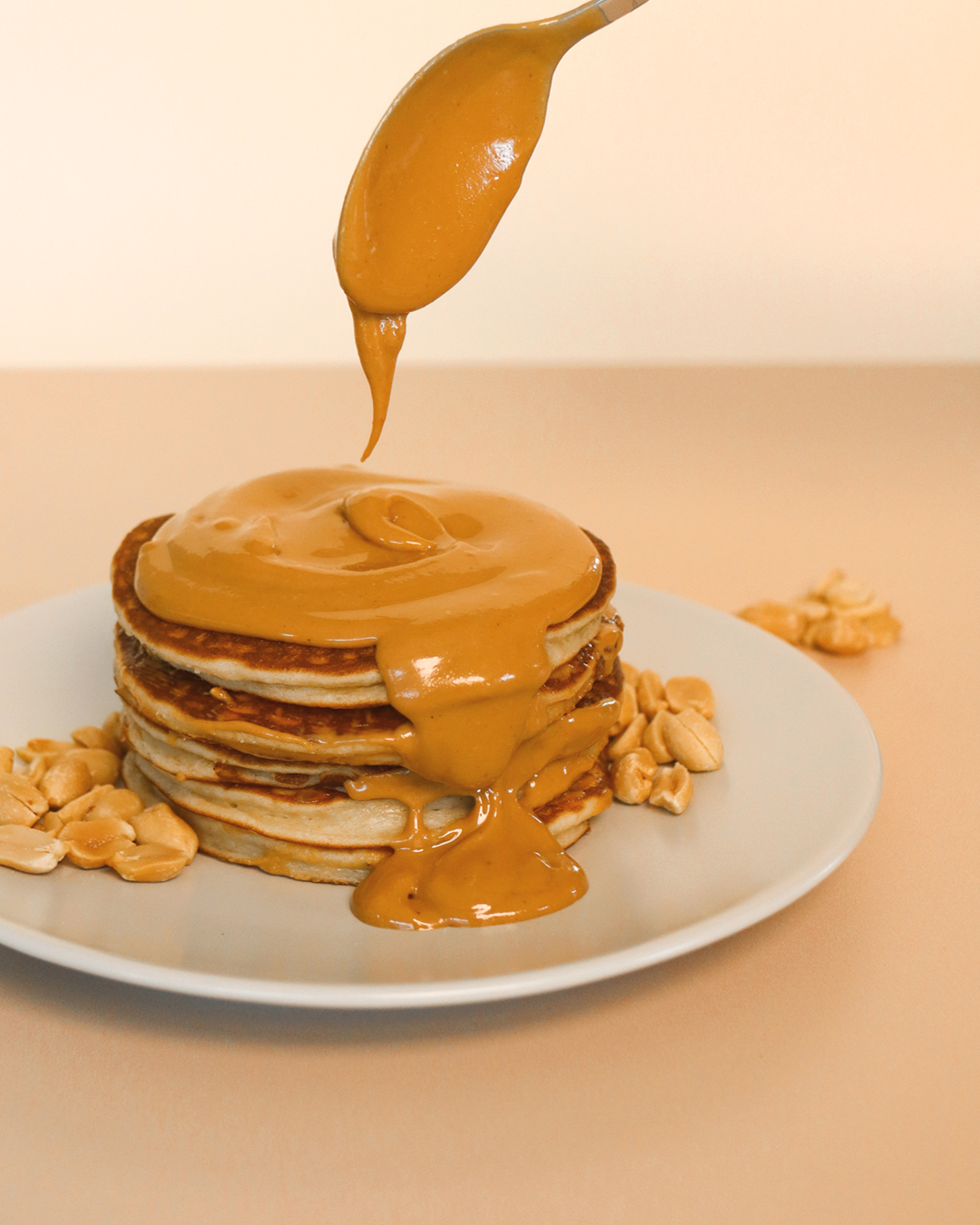 • Servez les pancakes avec la garniture au beurre de cacahuète et décorez avec vos fruits préférés et quelques fruits secs.
